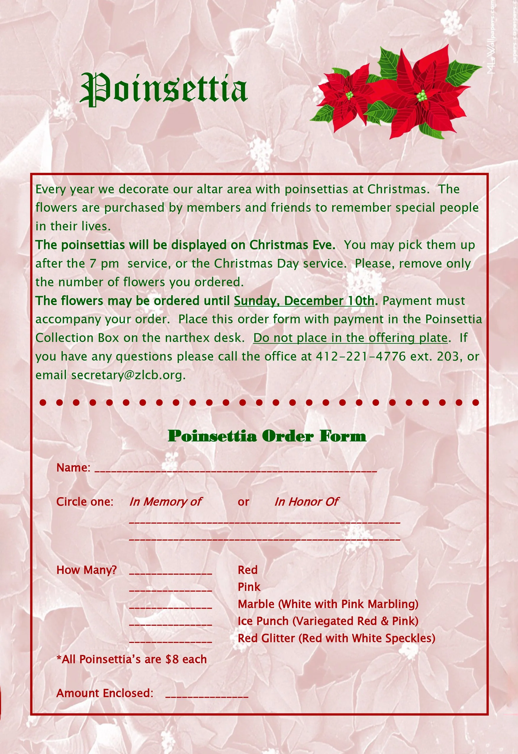 The flowers may be ordered until Sunday, December 10th. Payment must accompany your order. Place this order form with payment in the Poinsettia Collection Box on the narthex desk. Do not place in the offering plate. If you have any questions please call the office at 412-221-4776 ext. 203, or email secretary@zlcb.org.