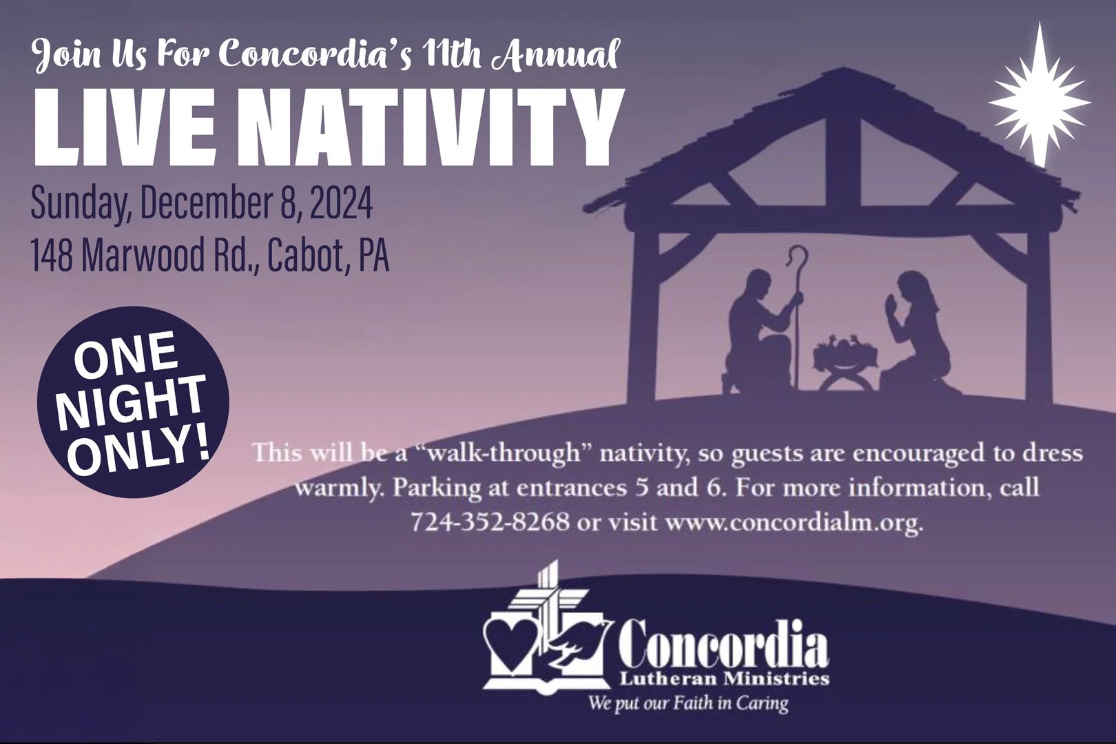 This will be (an outdoor) “walk-through” nativity, so guest are encouraged to dress warmly. Parking at entrances 5 & 6. For more information, call 724-352-8268 or visit www.concordialm.org