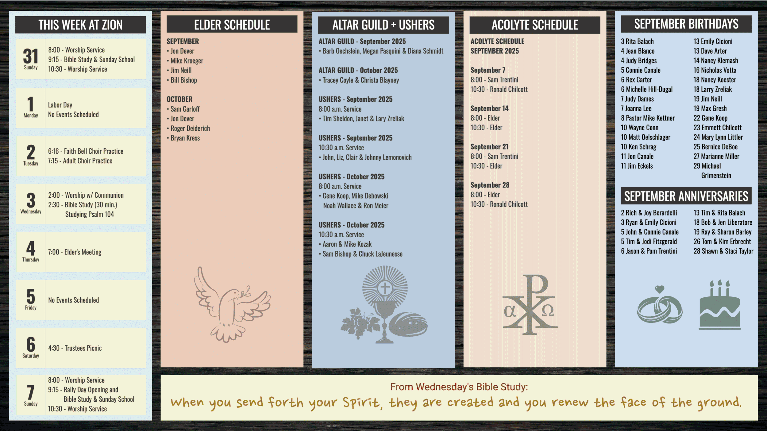 The Trustees want to thank Zion Webmaster “extraordinaire” Brent Miller for his extensive research and expertise in transitioning us from our old-school bulletin board to updated digital bulletin board. Check out the new narthex screen for all the latest updates, photos, news, people, sign-ups, and happenings!