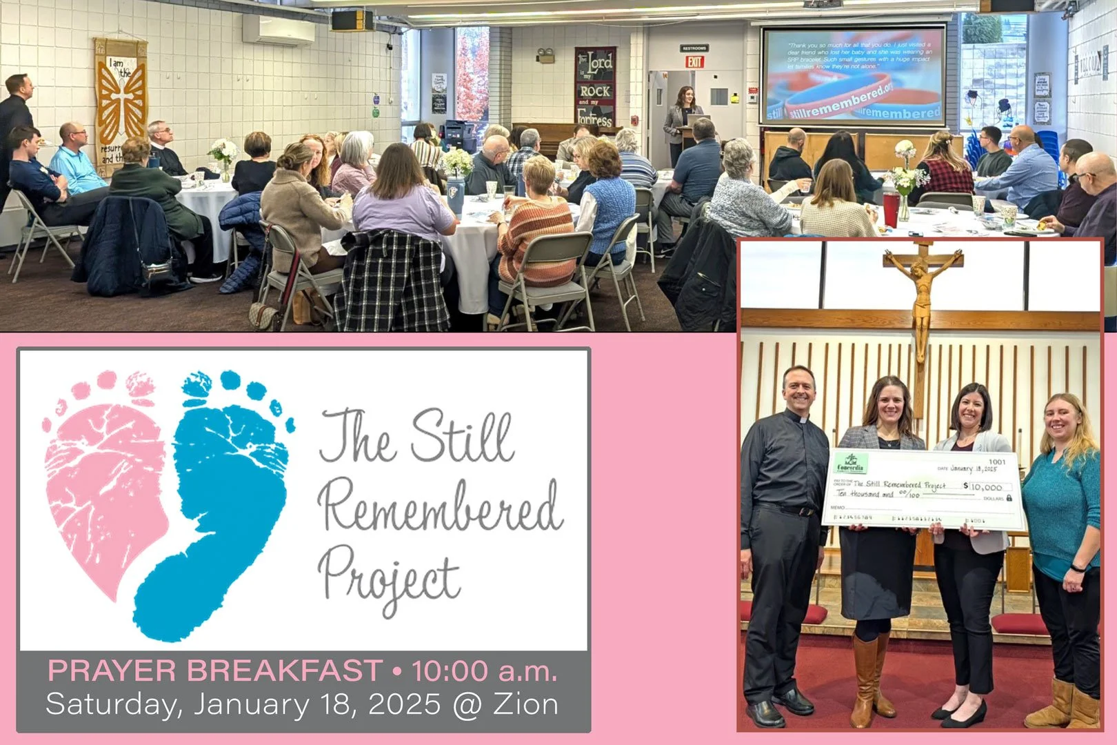 Zion hosted its first Prayer Breakfast on Saturday, January 18th in partnership with The Still Remembered Project (TSRP). More than 45 attendees from Zion, local LCMS churches and the community came together to pray and learn more about this local, faith-based organization that ministers to those who have experienced the loss of a child through miscarriage or stillbirth.